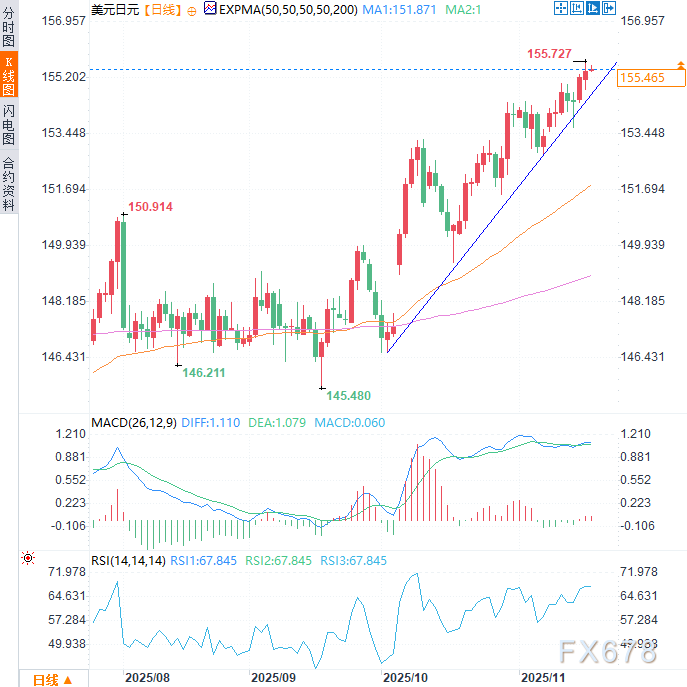 尽管涨势加速,但从14日相对强弱指数(RSI)来看,该货币对在技术上尚未进入超买区域。这意味着若就业数据表现强劲,进一步降低美联储12月降息的隐含概率,汇价可能继续上攻156.00及以上关口。