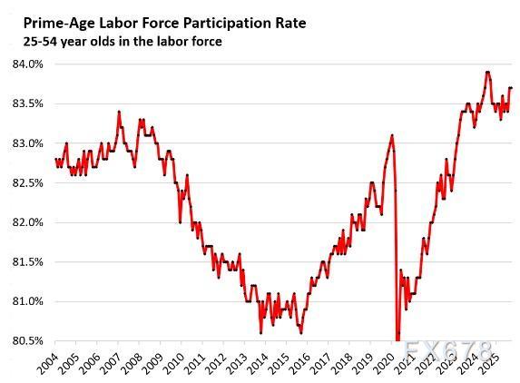 劳动参与率反映的是总人口中已就业或正在寻找工作的比例。当人们退休并停止找工作时,他们会退出劳动力市场,但仍属于总人口的一部分。约15年前开始的婴儿潮一代退休潮仍在持续,这一趋势拉低了整体劳动参与率——这些退休人员仍在总人口统计范围内,但已不再计入劳动力市场。