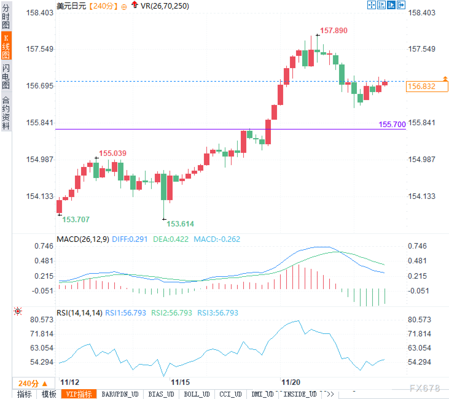从240分钟图看,美元兑日元自153.70附近一路震荡上行,在153.61形成阶段低点后,加速突破155.70一线,最高触及157.89,目前回落至156.80附近横盘整理。整体结构仍属中期上升趋势中的高位整理阶段。MACD柱能在高位逐步缩短,价格进入动能修复与方向选择期。RSI此轮从超买区80附近回落到中性偏上的50~60区间,表明情绪由极端乐观转为相对均衡,短期追涨意愿有所降温,但空头优势尚不明显。