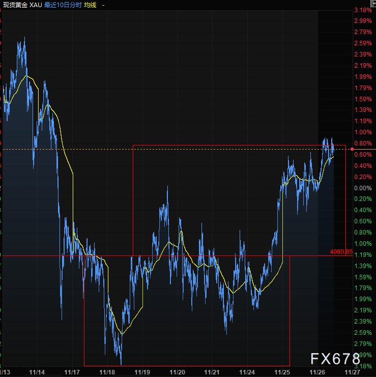 汇通财经APP讯——周三(11月26日)亚欧时段,现货黄金与亚洲股市一起继续走强,目前交投于4160附近,涨0.73%。交易员计入12月美联储降息84%的概率,同时美元指数大幅调整,使得黄金买盘持续涌入,推动黄金价格攀升至两周高位,成为贵金属市场的核心领涨品种。