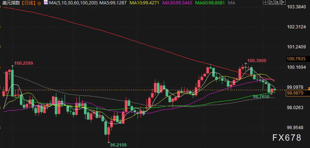 汇通财经APP讯——美元指数周五承压,收报98.98,本周累计下跌0.5%,接近五周低点,市场对美联储下周降息的预期持续升温,成为本周外汇市场的主导因素,交易员预计12月10日降息的可能性已接近90%。