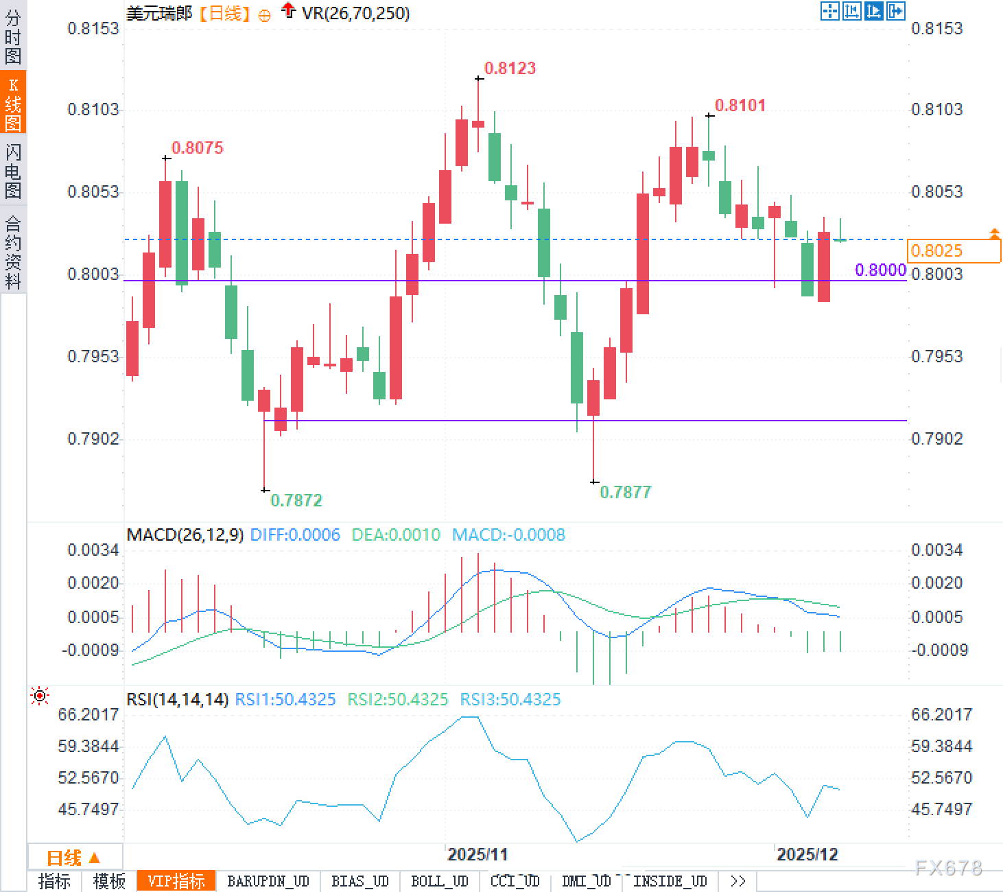 从美元兑瑞郎日线图来看,汇价当前报0.8025,正处于关键的多空分水岭附近。图表显示,汇价在近两个月内呈现明显的宽幅震荡格局,上方0.8123和0.8101构成双重阻力结构,下方0.7872和0.7877形成双底支撑区域。当前价位正好处于0.8000整数心理关口上方,该位置具有重要的技术意义。